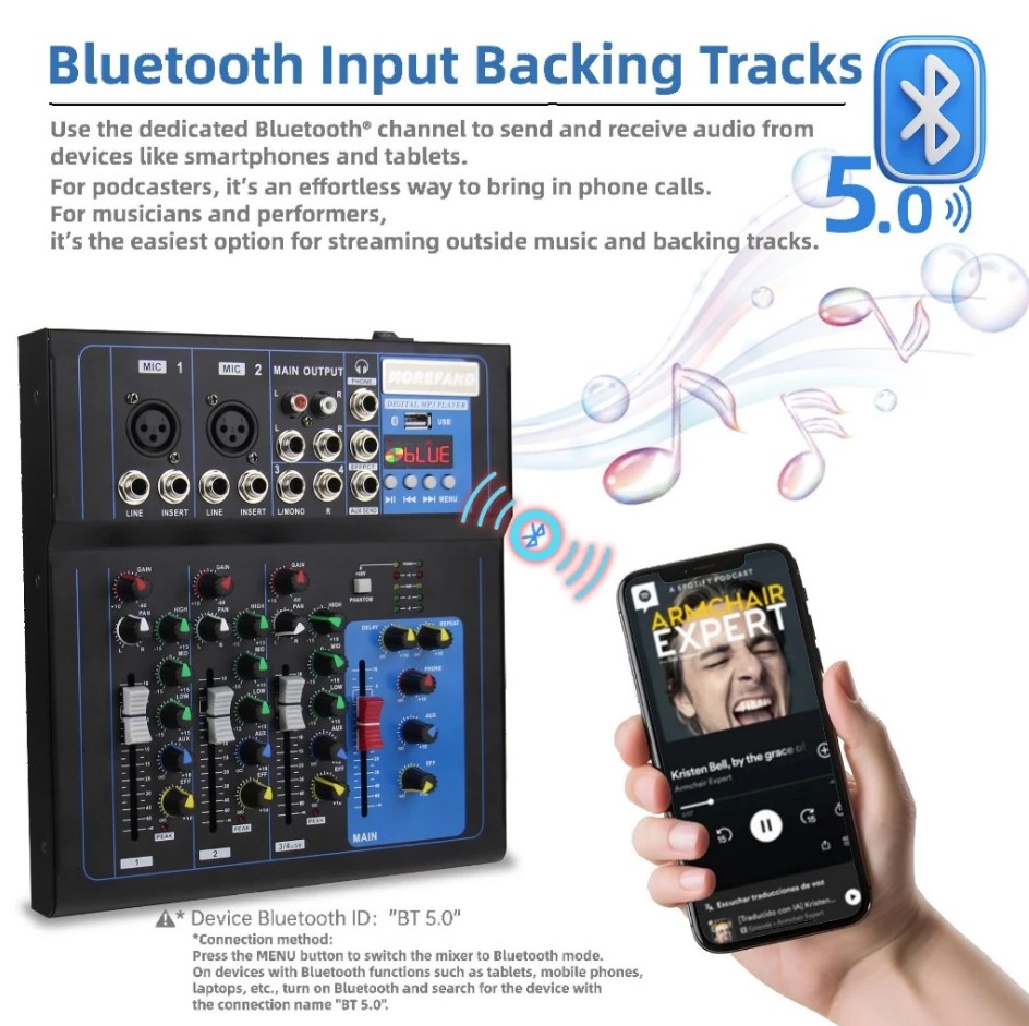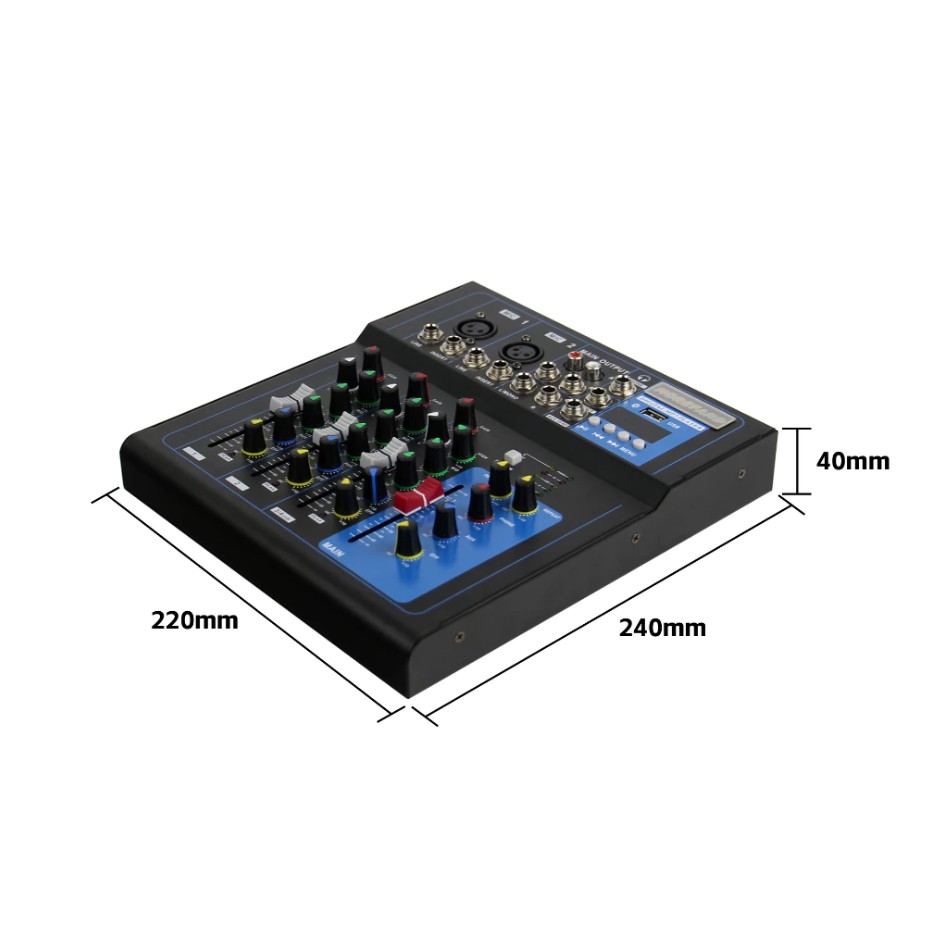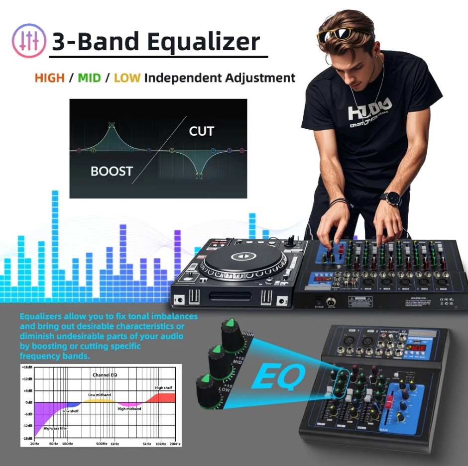 Individual gain, low, mid, high, AUX, pan, faders, eff, delay, repeat control knobs