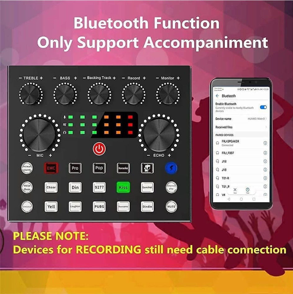 【Excellent Sound Quality and Bluetooth Accompaniment】The upgraded version live sound card voice changer supports Bluetooth wireless accompaniment, open the phone Bluetooth, search for “FRJ-speaker” and connect. Adopt dual DSP intelligent processing chip to adjust the rhythm in time, making the audio signal stable and clear, and the output is better.