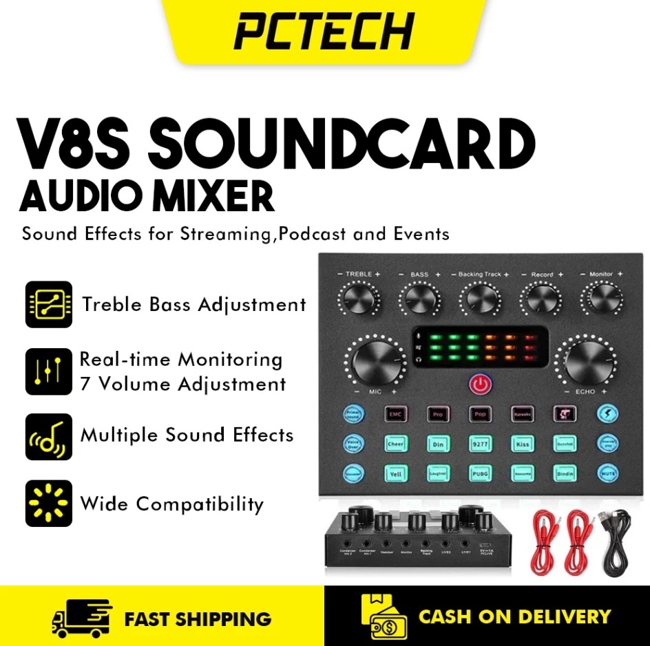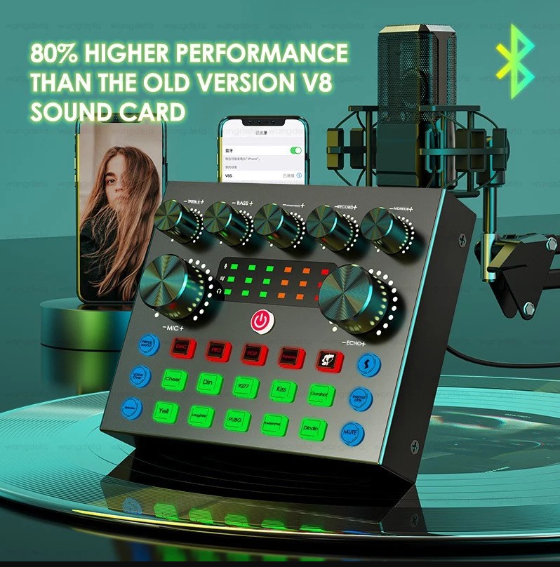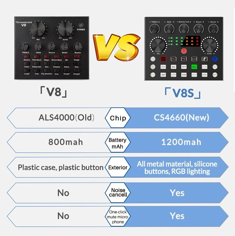 【Multiple Sound Effects and Voice Change Function】The V8s sound card have 10 funny sound effects, 4 kinds of voice changing functions and 7 kinds of volume adjustment modes.The V8 sound card have 12 funny sound effects, 4 kinds of voice changing functions and 7 kinds of volume adjustment modes. V8 and V8s are sent randomly